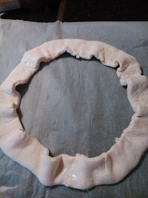 Les tallem just pel mig , és a dir, de cada làmina en treguem dues tires iguals que ajuntarem mitjançant una mica d'aigua. Jo he utilitzat tres tires per tortell